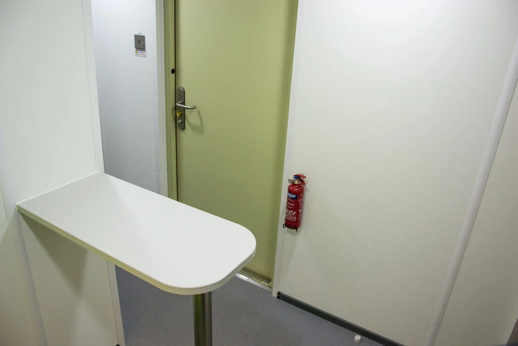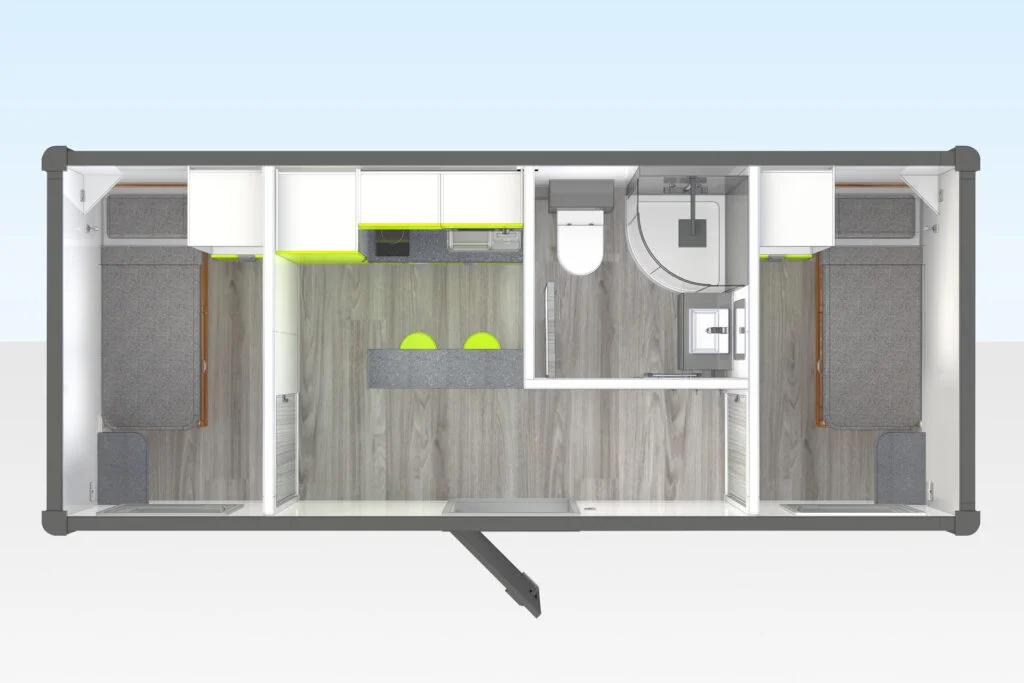 Esta cabina para dormir modular móvil de 22 pies x 9 pies cuenta con dos dormitorios separados y una sala de estar central que incluye una cocina pequeña y un baño/ducha. Está diseñado para proporcionar cómodos dormitorios cuando y donde lo necesite.
